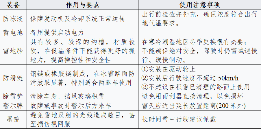 充分的装备准备是确保冰雪天气安全出行的重要保障。根据车辆状况、行驶路线和天气条件,驾驶人应提前准备以下装备,做到有备无患。▼