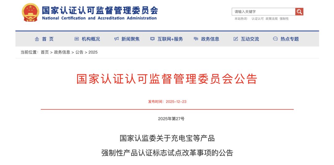 红星资本局注意到,就在2025年12月23日,市场监管总局(国家认监委)发布公告,对充电宝、燃气燃烧器具、电动自行车等共计3类11种高风险产品实施CCC认证标志试点改革。
