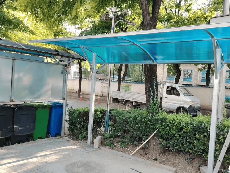 经踏查选址,最终选定1号楼2号楼之间电动自行车充电车棚与停车位之间杂草地空地和1号楼垃圾桶站后闲置角落。同时,充分考虑使用方便与颜色适配,采用了与原有风雨棚颜色一致的材料进行搭建,避免颜色差距较大产生过度的视觉冲突,地面铺设防滑透水砖和方便推行的坡道,进一步方便居民通行。