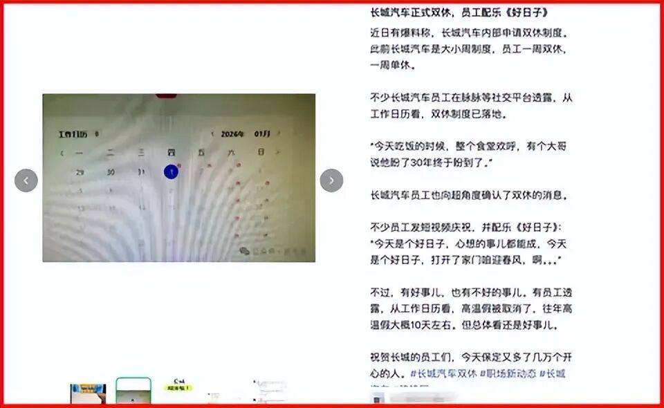 此次双休调整于2026年正式落地,覆盖全体员工,此前流传数月的“取消大小周”传言终于成真。这一调整意味着,长城员工的休假制度完成了从“每月单双休”到“大小周”“大小周+高温假”,再到完整双休的第四次迭代。