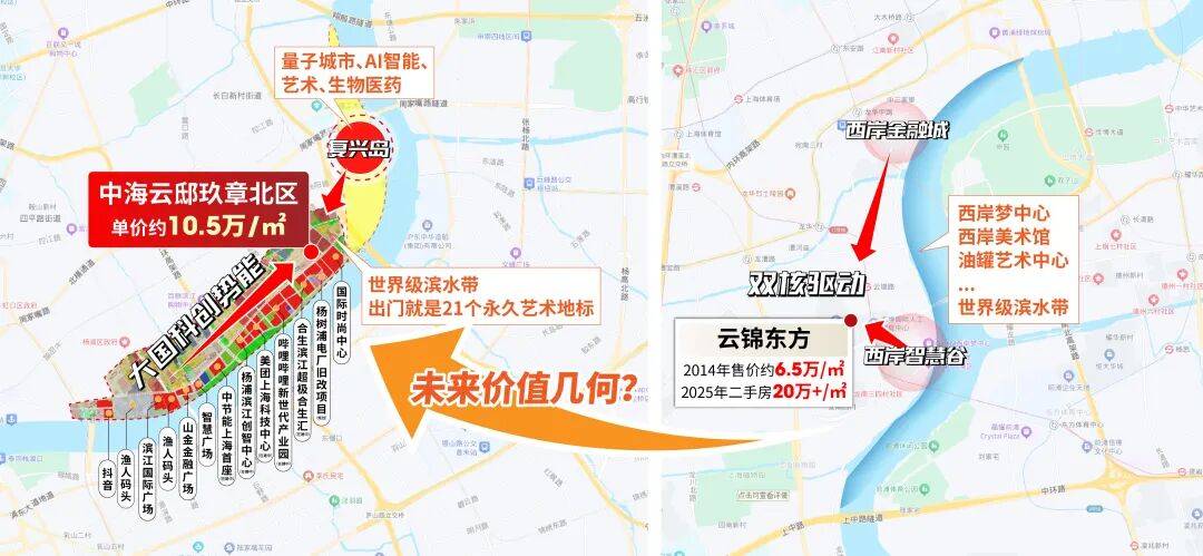 其实答案已经给出,日前杨浦政府发布规划,以云邸玖章旁边的复兴岛为核心,中北段将打造成具有世界影响力的科创高地、创新创业集聚区和高品质水岸示范区。