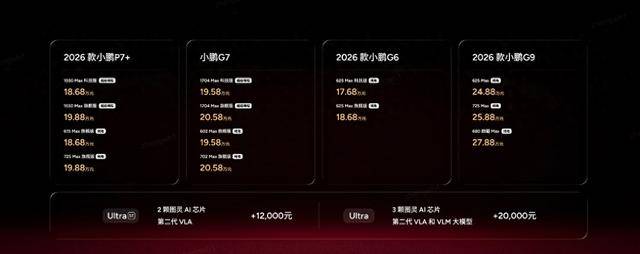 本次发布会,还带来了2026款小鹏G6与2026款小鹏G9焕芯登场。继承小鹏家族的智能化基因,搭载自主研发的高算力图灵AI芯片,实现全系标配天玑AIOS 6.0,升级了智能座舱体验。并且在版本设计上,提供从750TOPS到2250TOPS的三档智能进阶选择,满足消费者对智能辅助驾驶和智能座舱的不同需求,为用户带来AI出行享受。