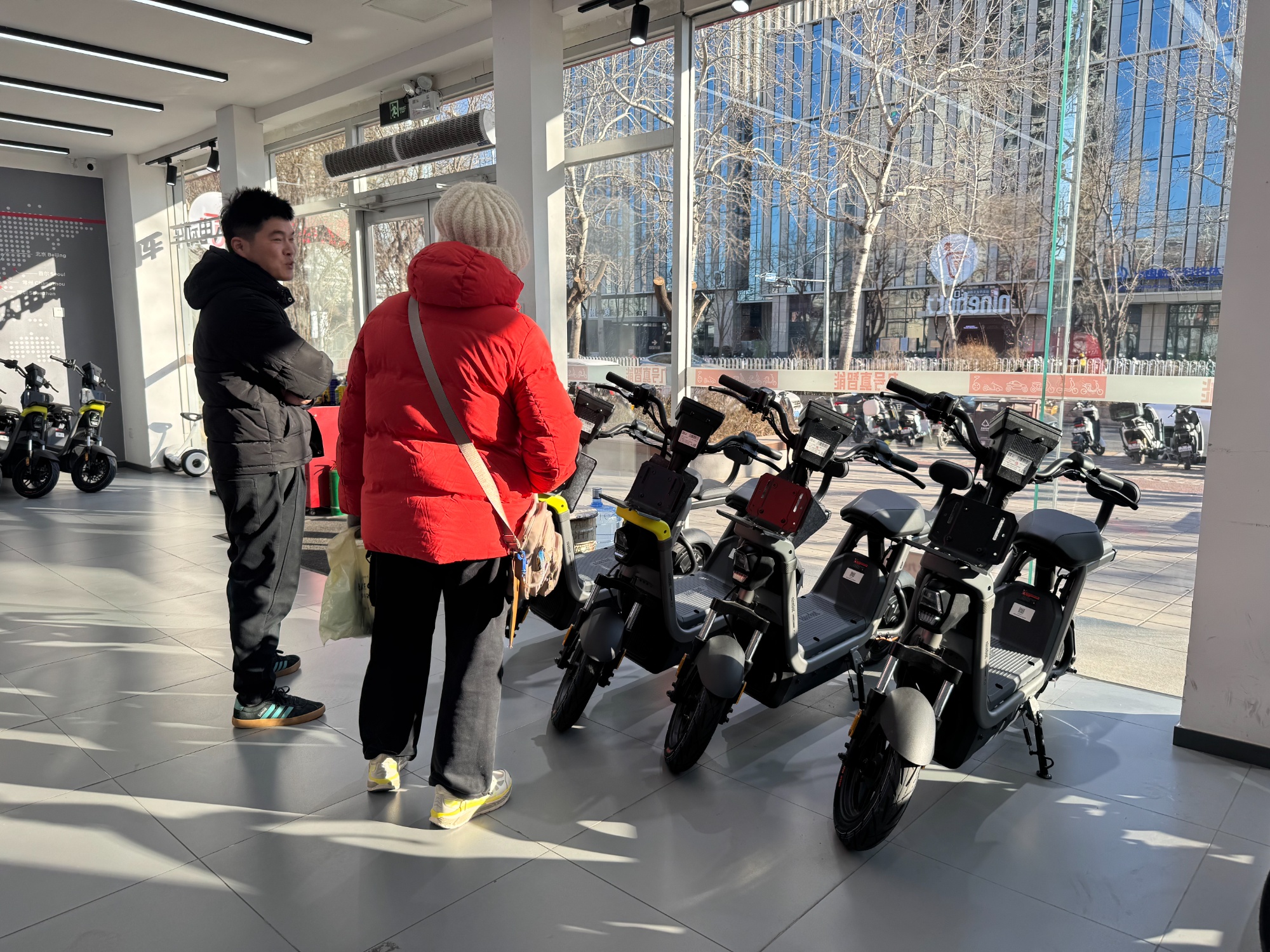 在北京海淀一家九号电动车门店内,顾客正询问新标准车型续航情况。(央广网记者黄昂瑾 摄)