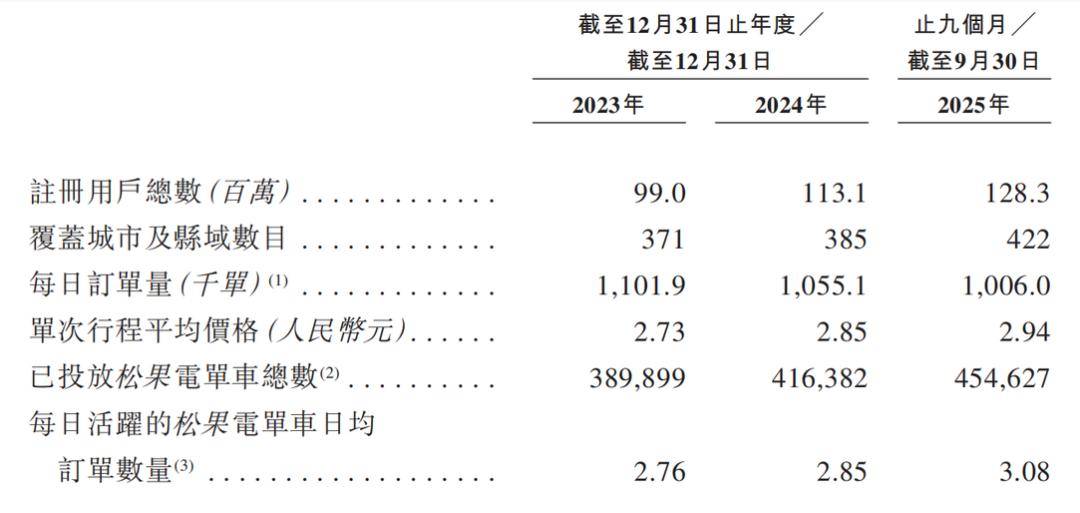 注册用户数从2023年末的9950万,一路增长至2025年9月底的1.28亿,累计新增超过2800万用户;投放的车辆总数也从40万辆增加至45.4万辆;活跃车辆的日均订单量甚至从2.95单微增到了3.08单;单次骑行的平均价格也从2.86元涨到了2.94元。