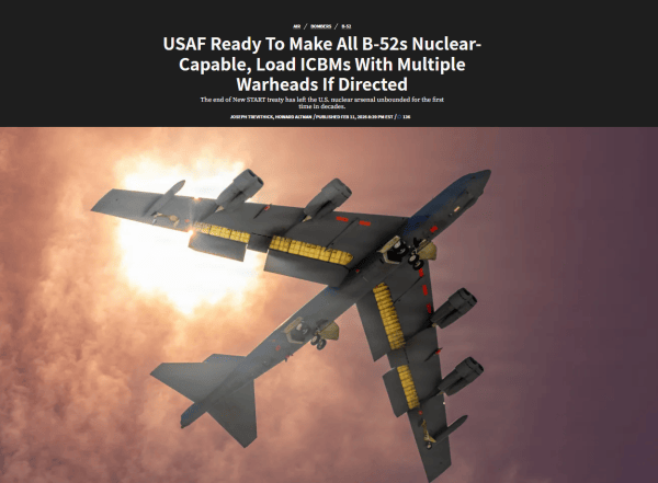 目前美国空军现役76架B-52H轰炸机里,仅有46架被允许携带核武器。而在条约失效以后,根据美国空军和海军的初步意愿,美军计划将所有76架B-52都恢复具备核打击能力。此外,美军计划将处于未部署状态的100枚“民兵Ⅲ”洲际弹道导弹恢复成部署状态,顺便将部分“民兵Ⅲ”洲从条约规定的单弹头改为成多弹头。而在海军方面,美国现役的“俄亥俄”型核潜艇在条约规定下只能携带18枚“三叉戟2D5”潜射洲际弹道导弹,未来美军将把这些弹道导弹核潜艇恢复成满载状态——也就是携带24枚。