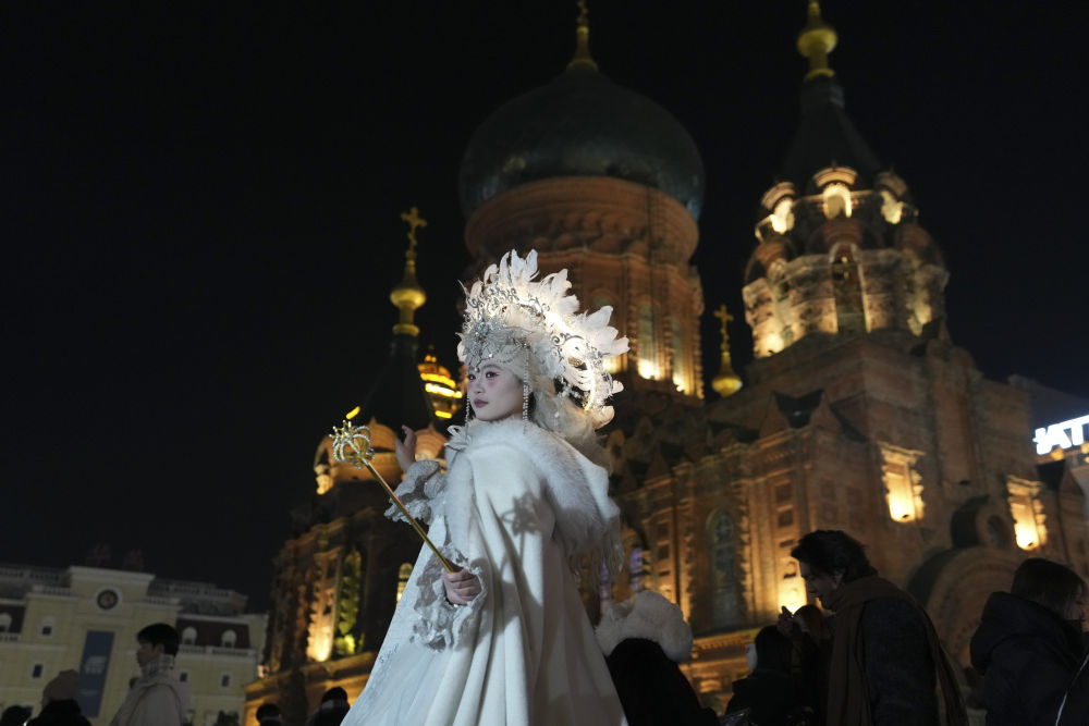 2025年12月7日,第六届哈尔滨采冰节在松花江畔开幕,精彩的采冰仪式和民俗体验互动吸引众多市民和游客参与其中。这是采冰节现场的民俗表演。